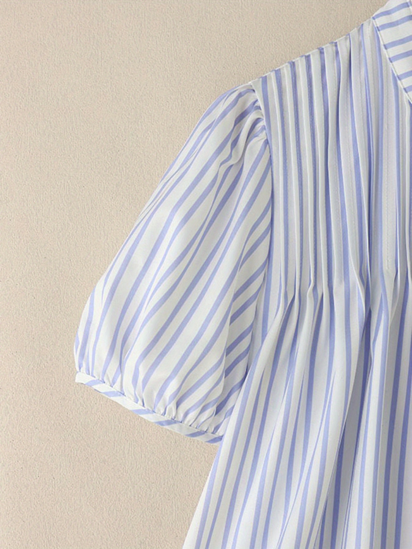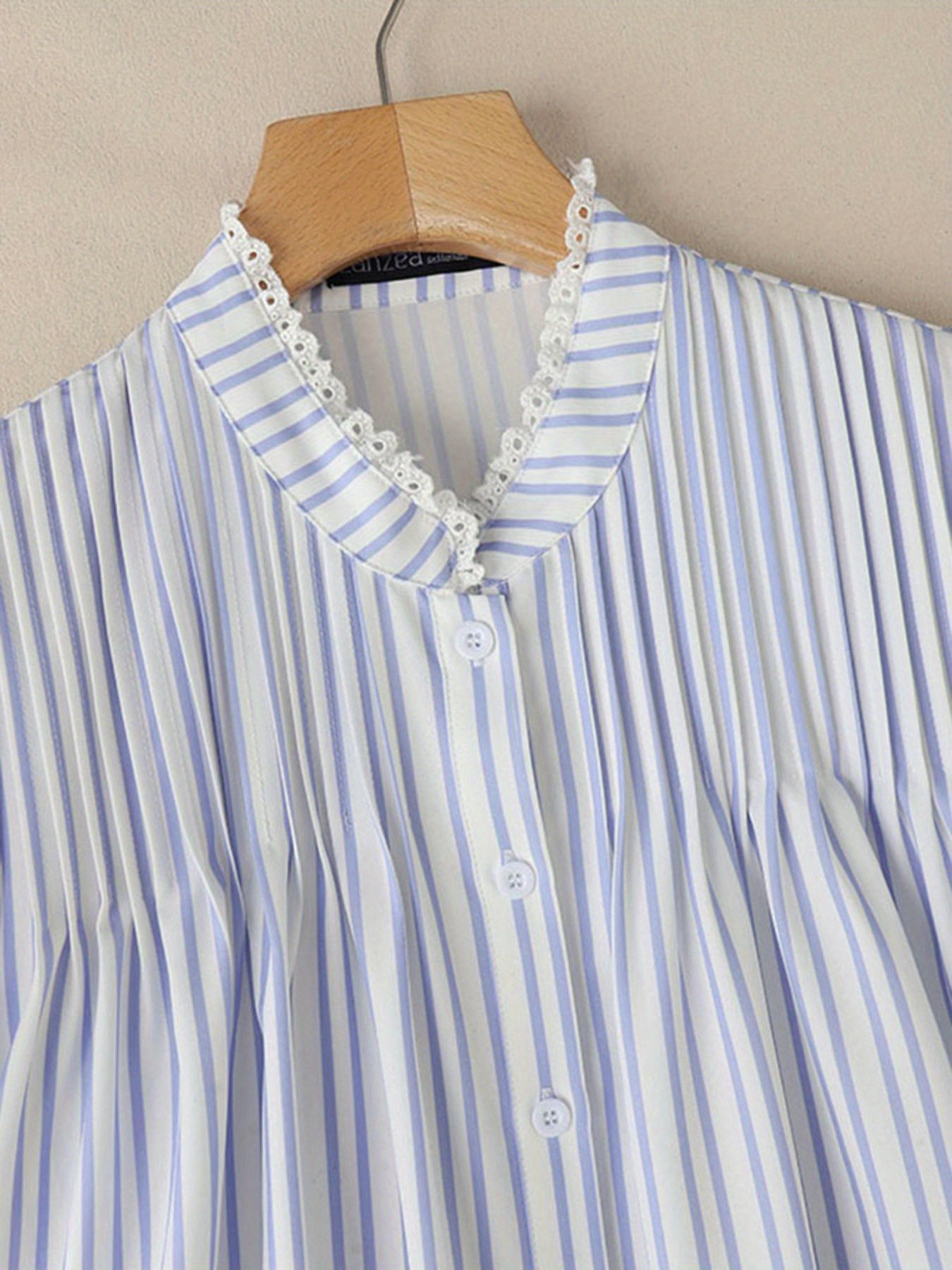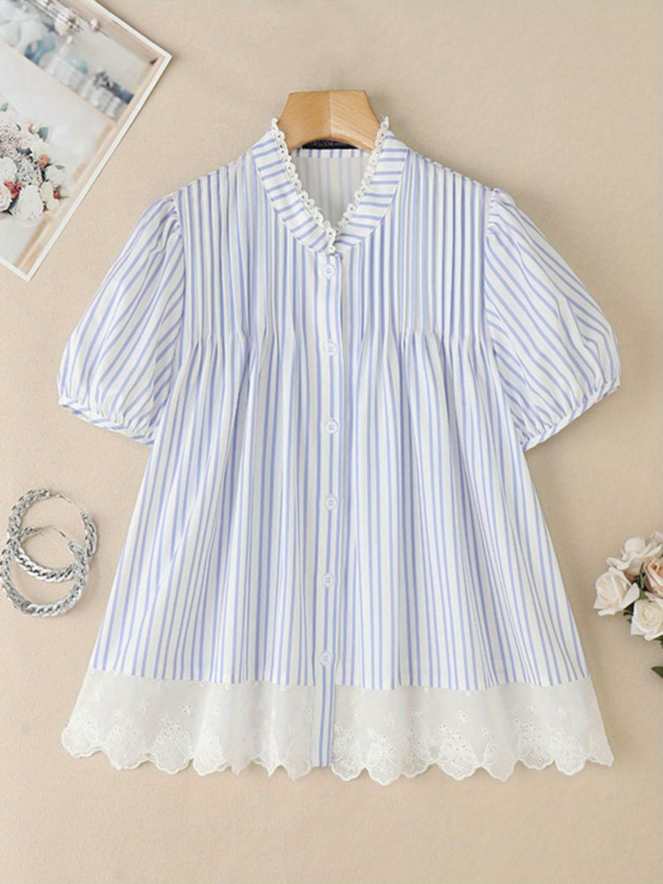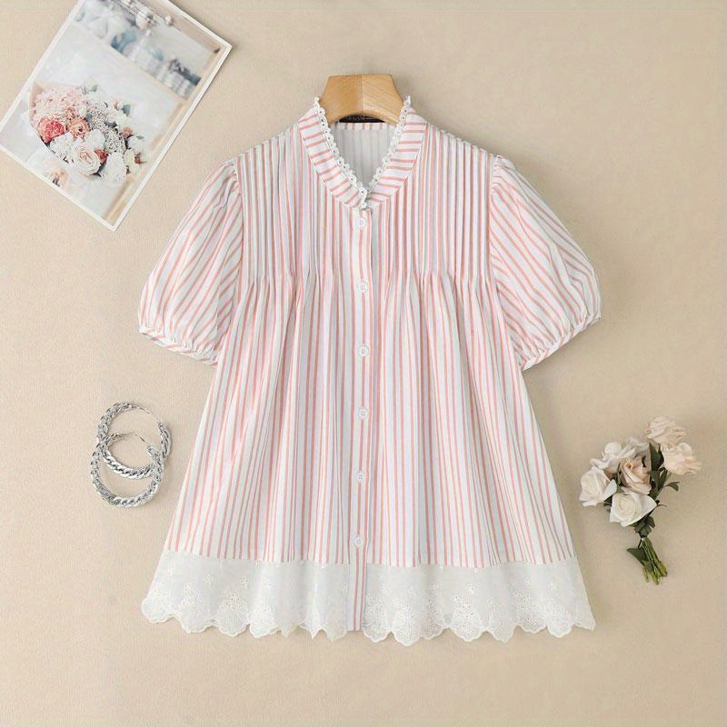 [ZANZEA Plus Size Blouse] Plus Size - ZANZEA Women's Plus Size Lightweight Elegant Blouse - Korean Style Striped & Lace Patchwork Stand Collar Puff Short Sleeve Single-Breasted Shirt, Breathable Summer Top for Office & Casual Outings, Versatile Clothing, Stylish Women