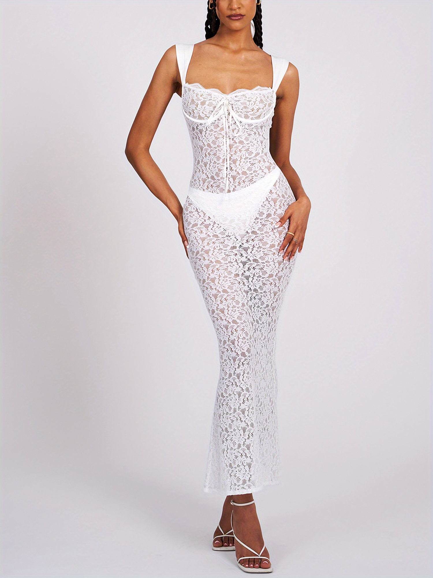 1pc Elegant Polyester Lace Sleeveless Maxi Dress for Women - Sexy Backless Bodycon Cami with Sweetheart Neckline, Solid Color, All-Season, Weave Knit Fabric
