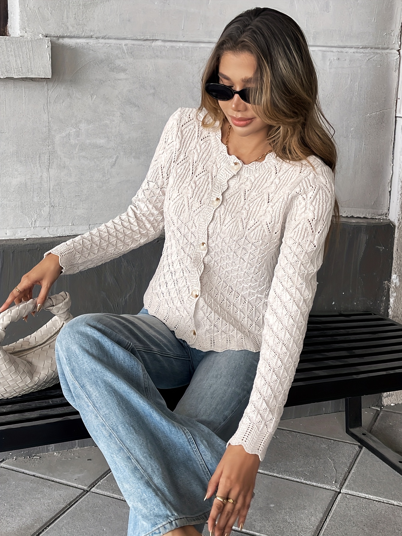 Elegant Women'S Cardigan - Long Sleeve, Round Neck, Button-Up with Eyelet Details, Solid Color, Perfect for Fall/Winter, Stylish Layering Piece, Stylish Layering Piece|Elegant Knitwear|Buttonup Closure