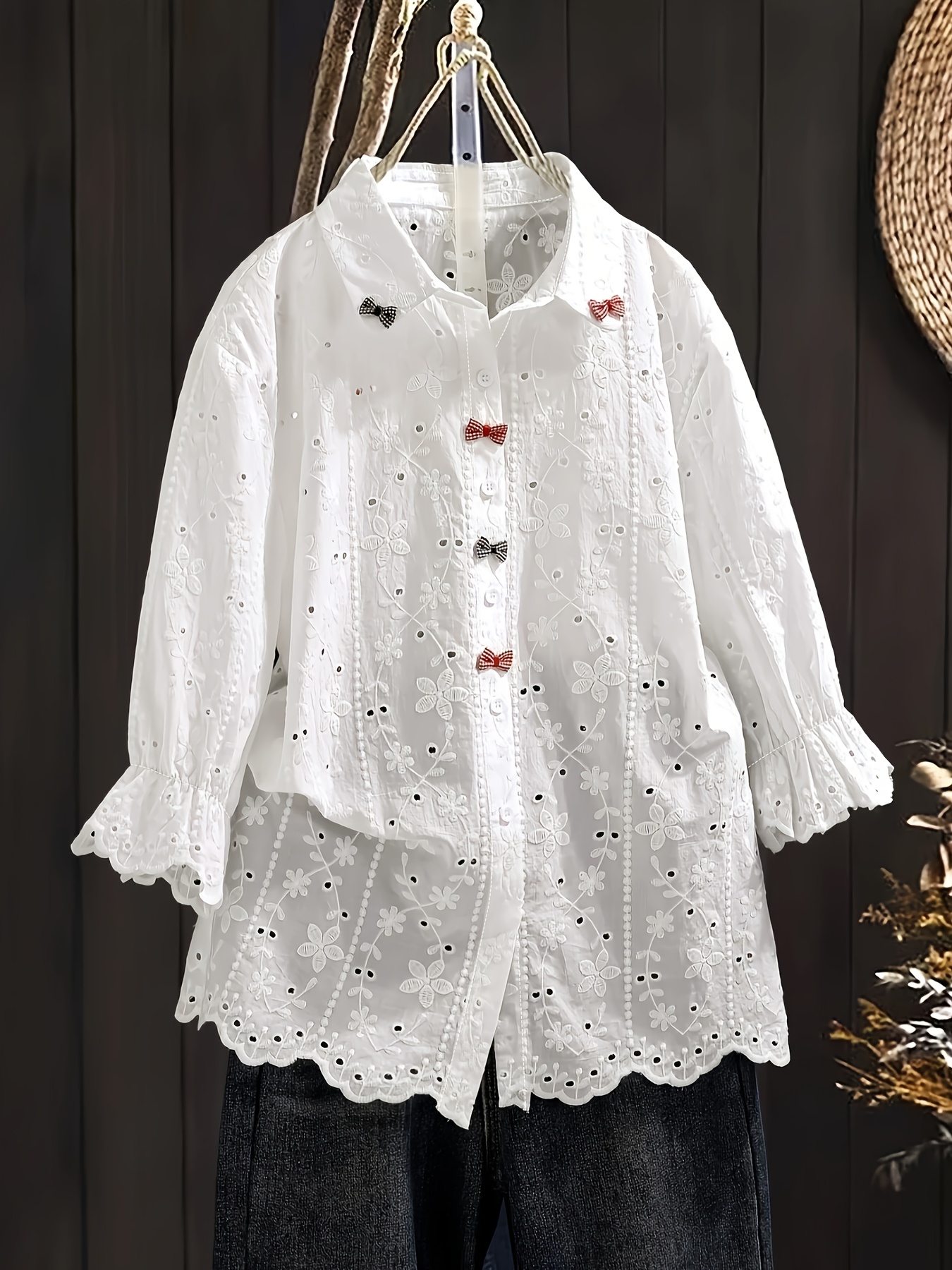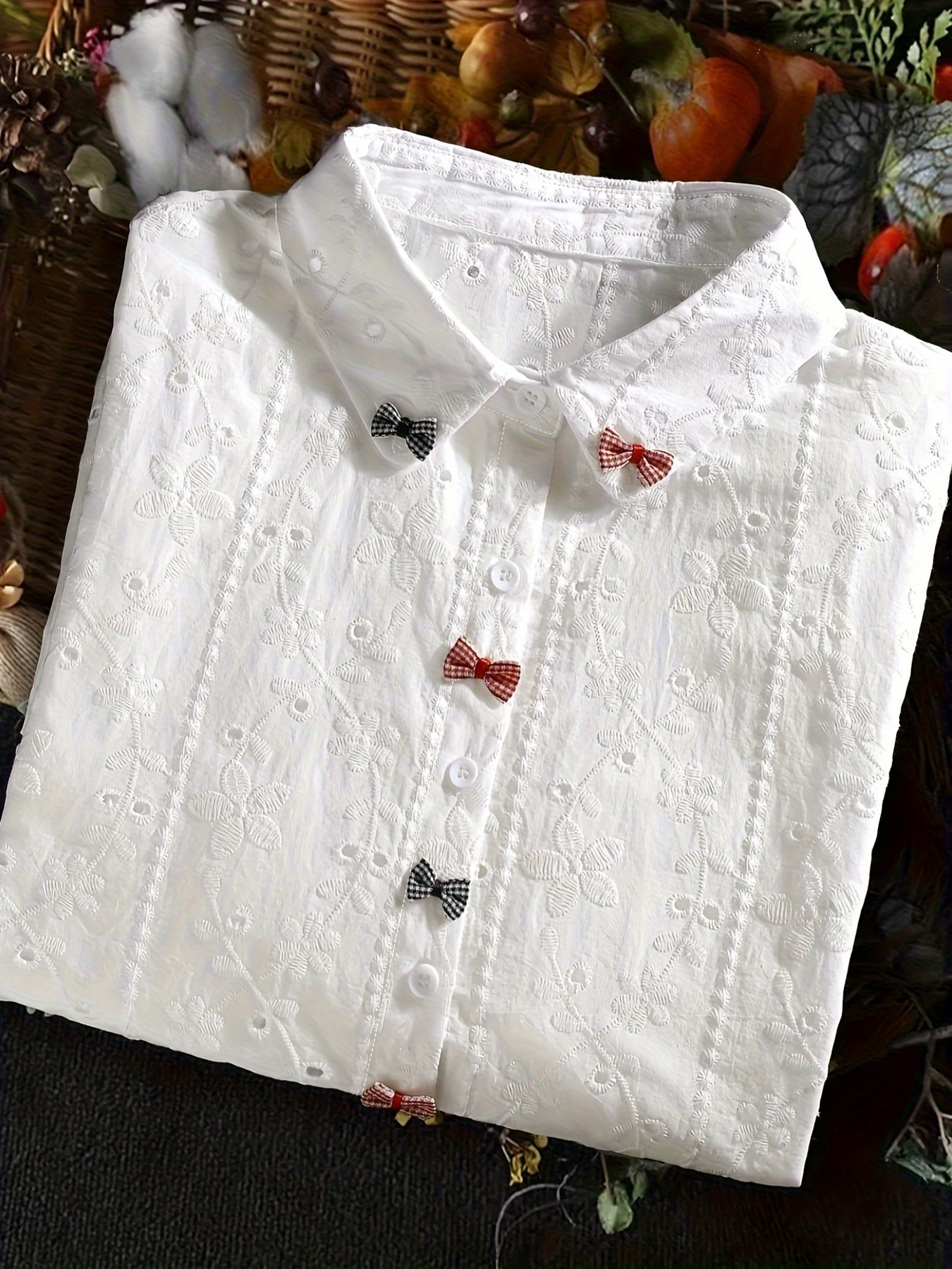 Plus Size, Women's Plus Size Elegant Blouse - Loose Fit Button-Front Placket Shirt with Red Accents, Breathable Semi-Sheer Top for Formal & Everyday Outfits - Machine Washable Non-Stretch Elegant Blouse