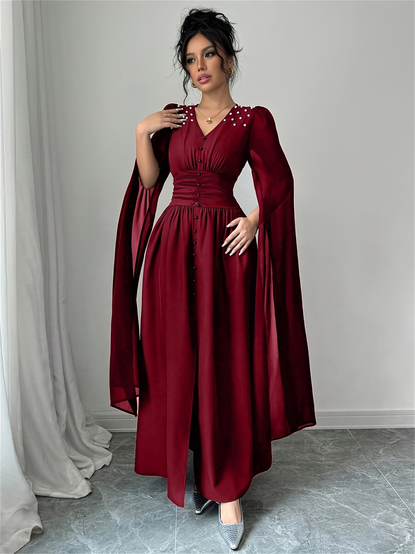 Women'S Elegant V-Neck Maxi Dress with Pearl Accents - Long Formal Party Wedding Guest Dress, Flattering Fit for Summer Events, Formal Events, Parties, Wedding Guest Attire, Vneck Design, Flowy Fabric