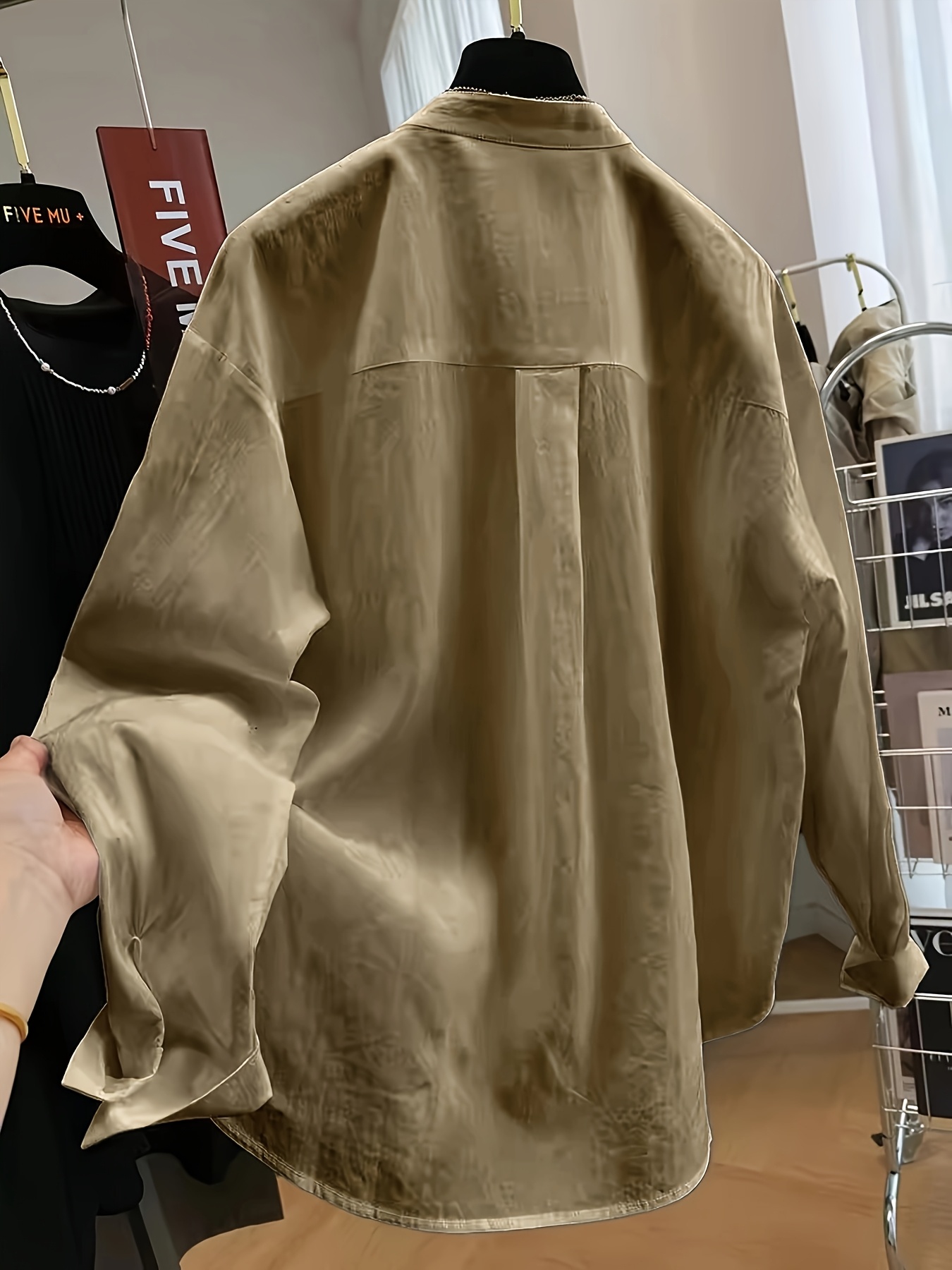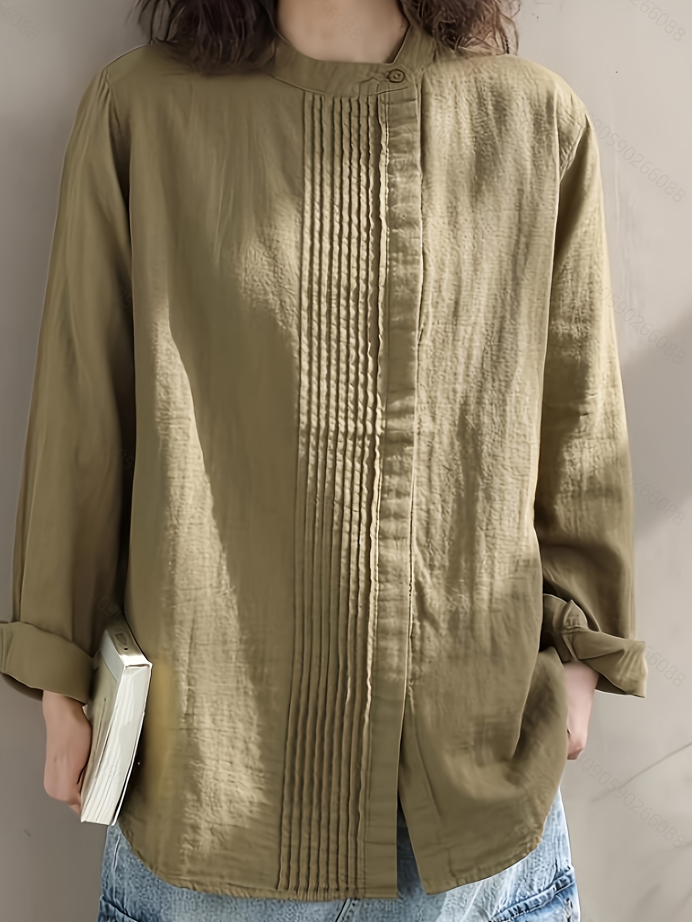 Plus Size - Women'S Casual Loose Fit Side Stand Collar Pleated Blouse - Solid Color Button-Up Shirt with Ribbed Texture, Long Sleeves, and Button Details for All-Season Wear, Versatile Fashion | Relaxed Fit Shirt | Nonstretch Fabric