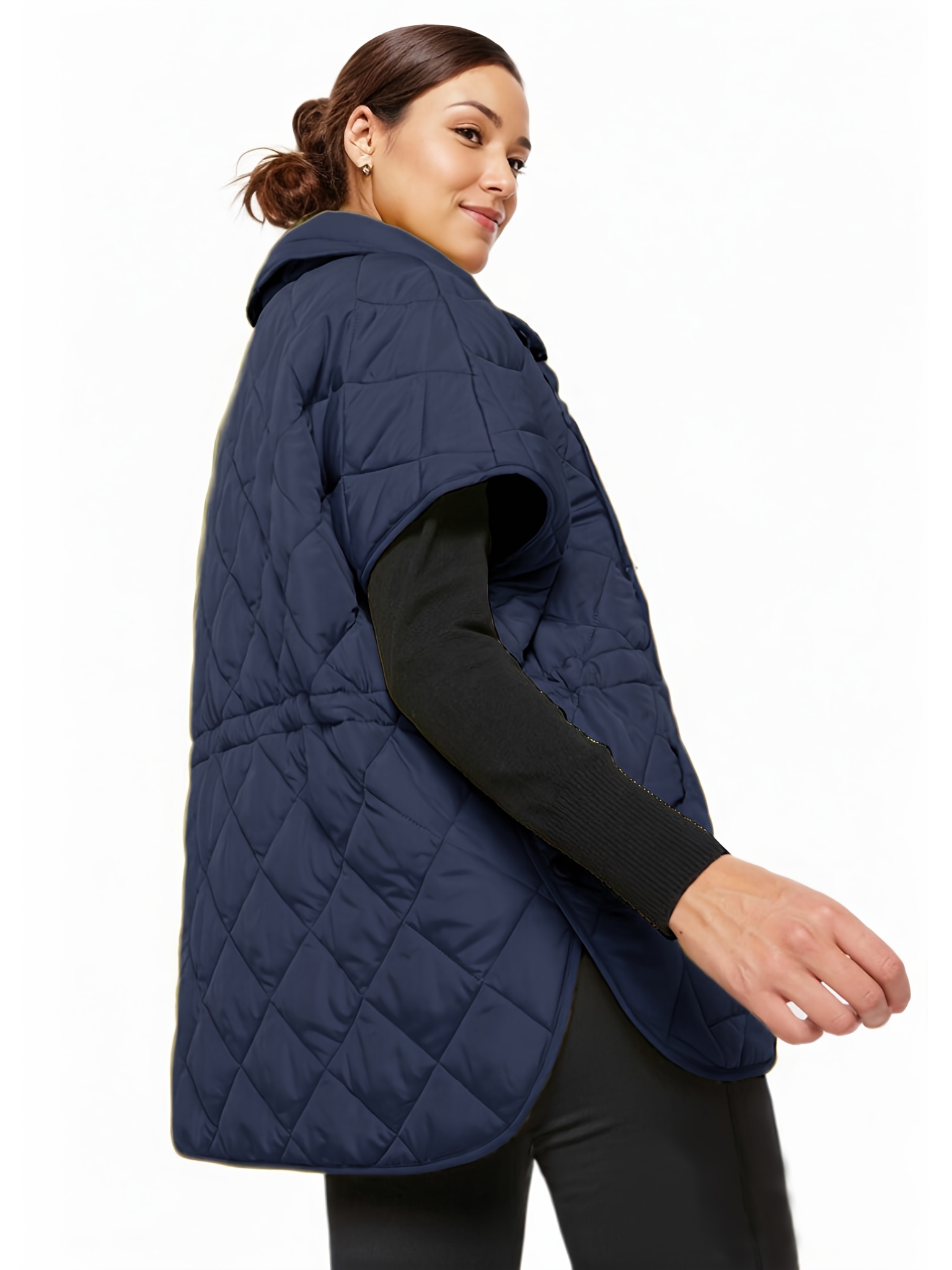 Plus Size, Women's High Quality Zip-Up Quilted Vest with High Stand Collar & Gatherable Waist - Wide-Cut Winter Coat, Full-Zip Front Closure, Machine Washable Outerwear for Casual & Formal Outfits (Solid Color, Green/Black/Navy/White) - Versatile Layering Piece, Relaxed Fit with Split Hem Design, High Quality Material for Wet Weather, Stylish and Functional Outerwear, Plus Size Fall Clothes