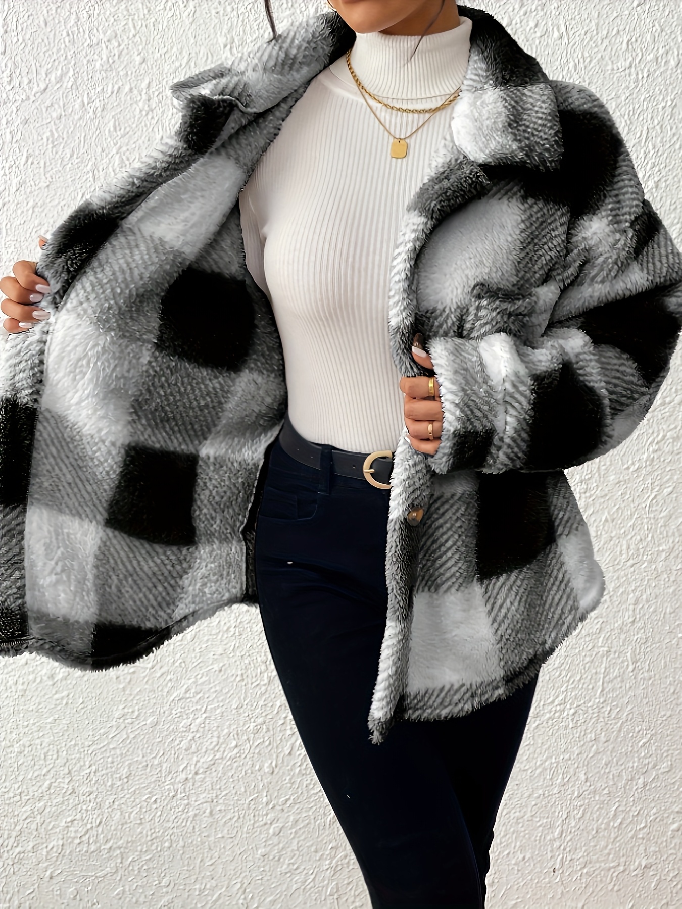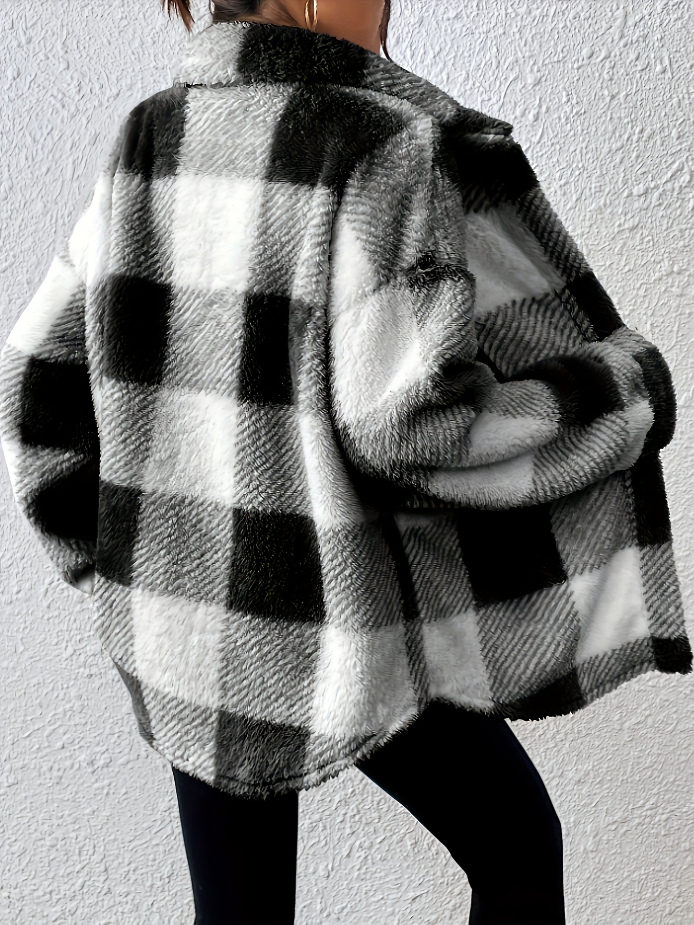 Plus Size, Women's Plus Size Elegant Plaid Jacket with Teddy Bear Collar & - Cozy Winter Coat, Black & White Check Pattern, Button Front Closure, Machine Washable Long Sleeve Outerwear for Fall/Winter (Casual to Formal) - Warm