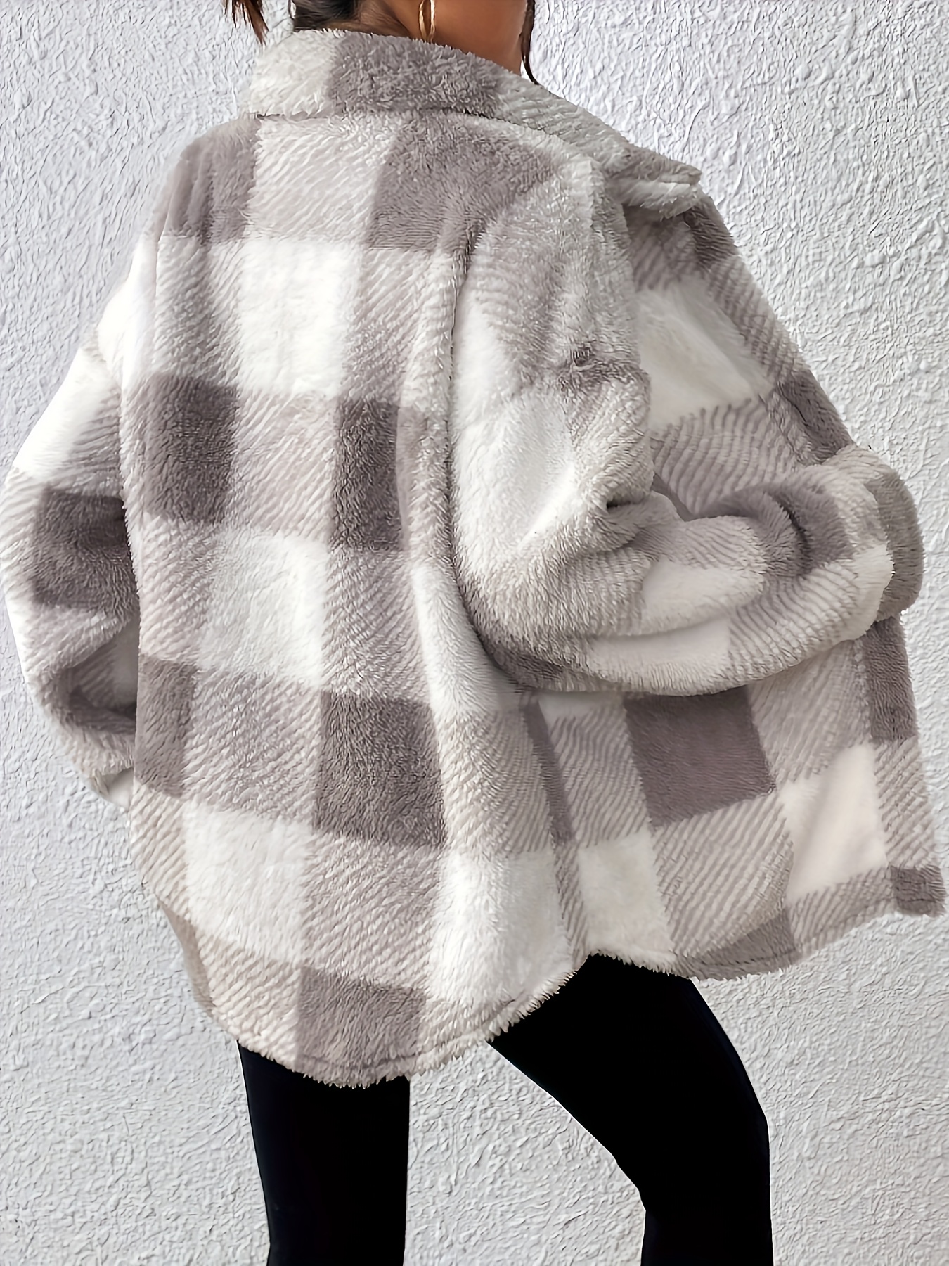 Plus Size, Women's Plus Size Elegant Plaid Jacket with Teddy Bear Collar & - Cozy Winter Coat, Black & White Check Pattern, Button Front Closure, Machine Washable Long Sleeve Outerwear for Fall/Winter (Casual to Formal) - Warm
