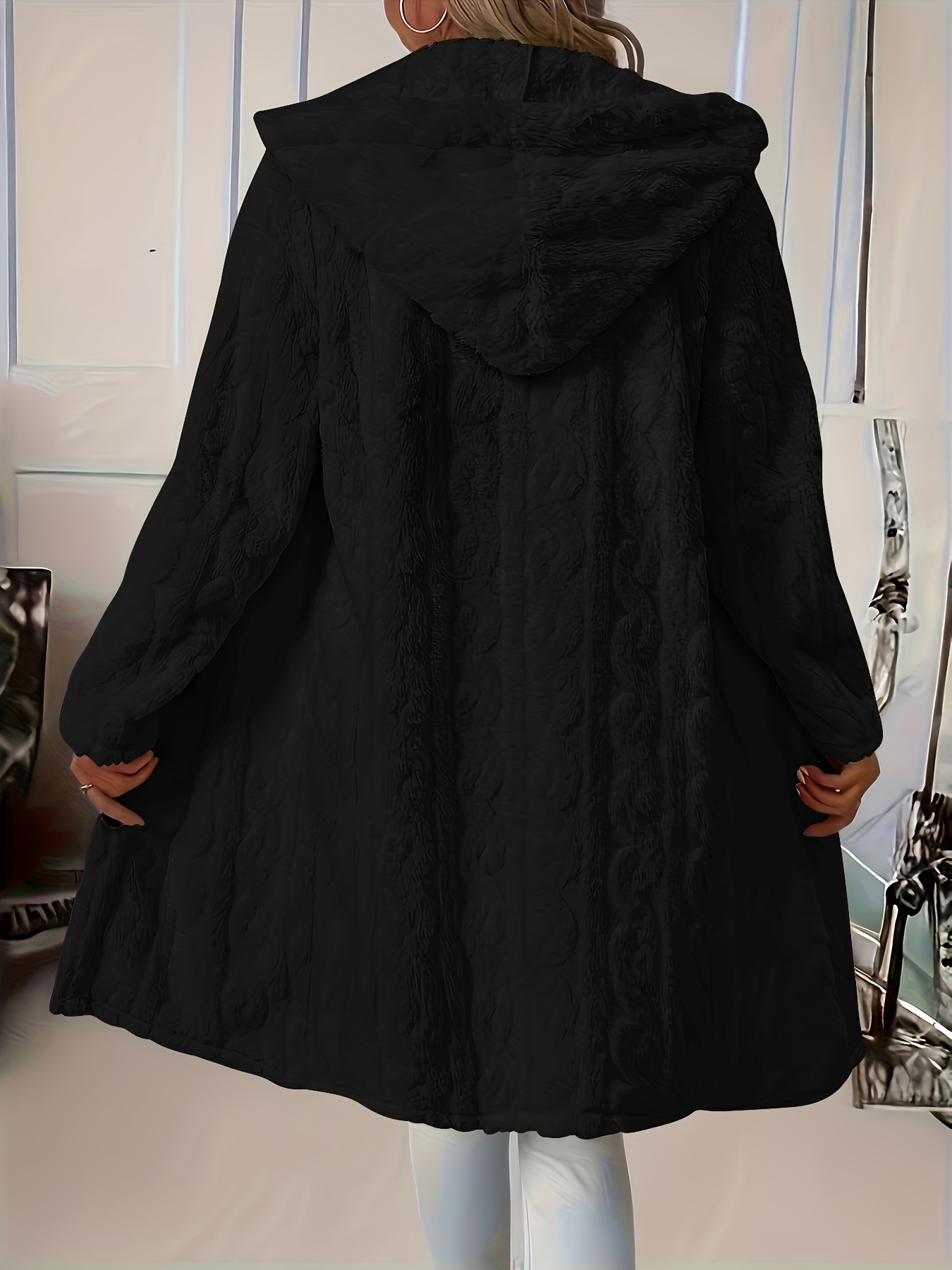 Plus Size - Elegant Plus Size Faux Fur Coat for Women - Long Sleeve, Button-Up, Hooded, Solid Black, Medium Stretch, Spring/Fall Outerwear, Stylish Layering Piece, Spring Outerwear | Buttonup Coat | Medium Stretch Fabric