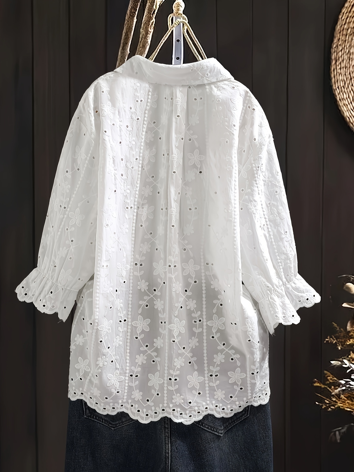 Plus Size, Women's Plus Size Elegant Blouse - Loose Fit Button-Front Placket Shirt with Red Accents, Breathable Semi-Sheer Top for Formal & Everyday Outfits - Machine Washable Non-Stretch Elegant Blouse