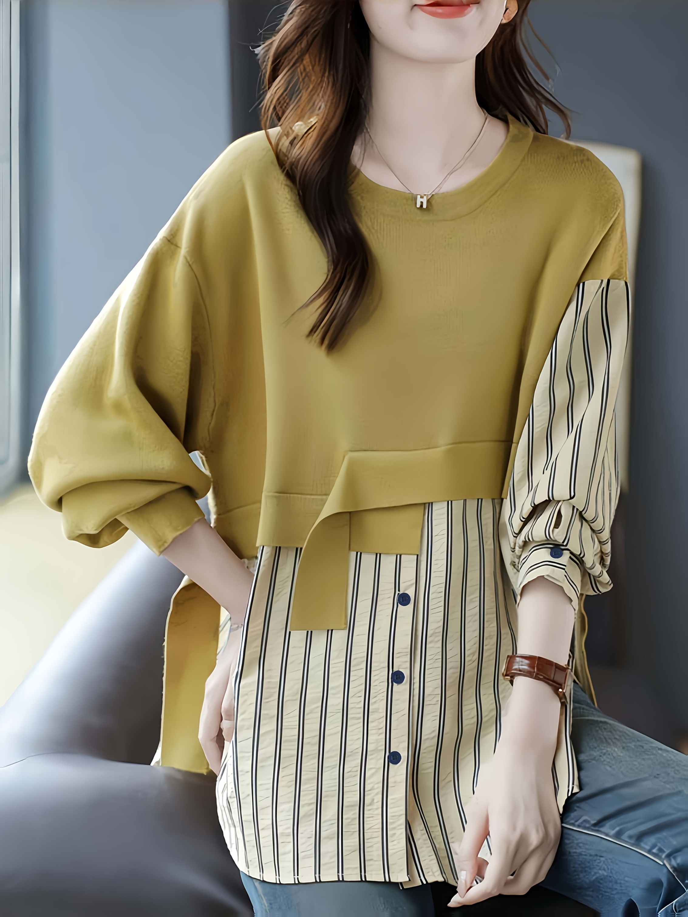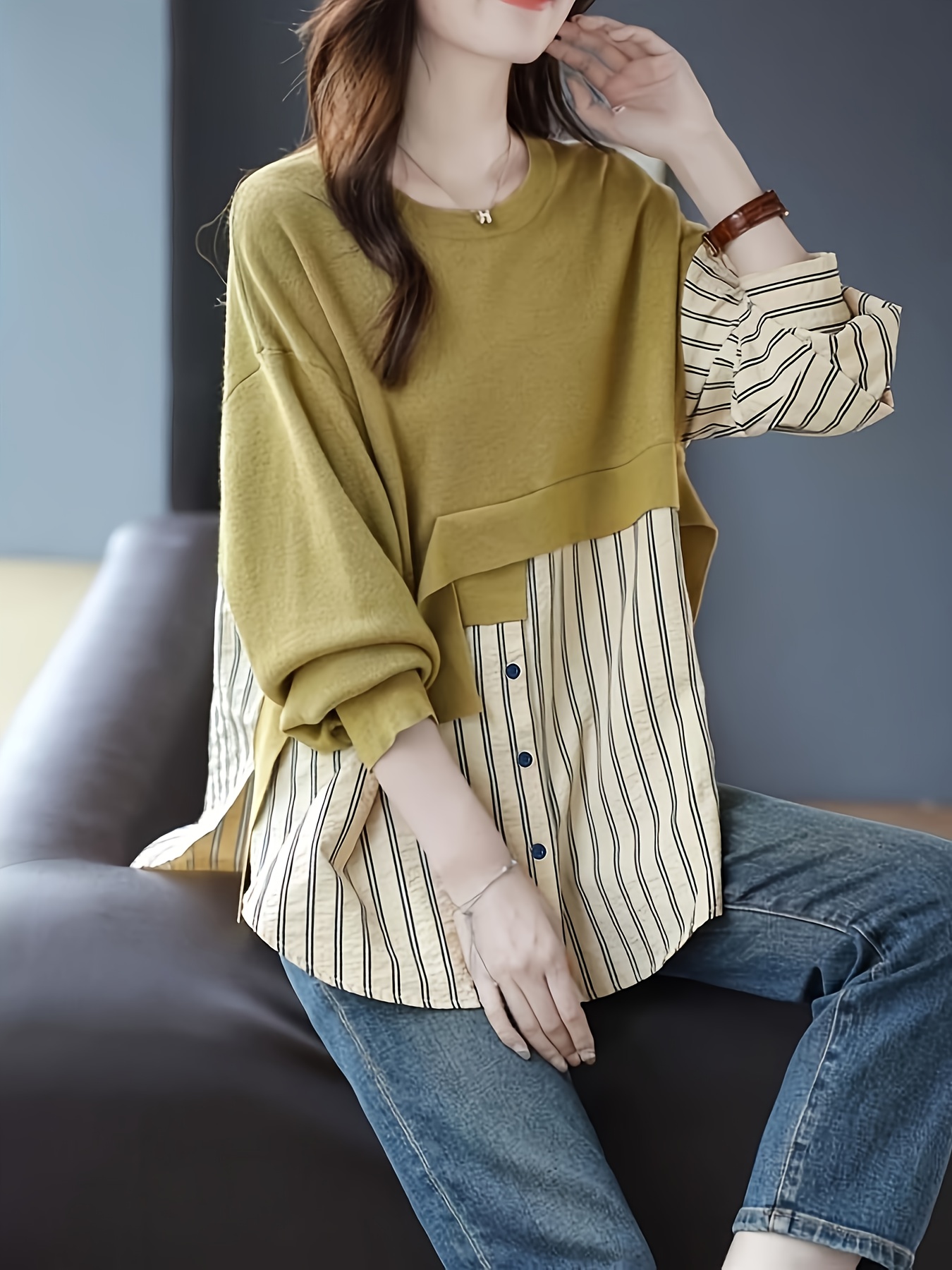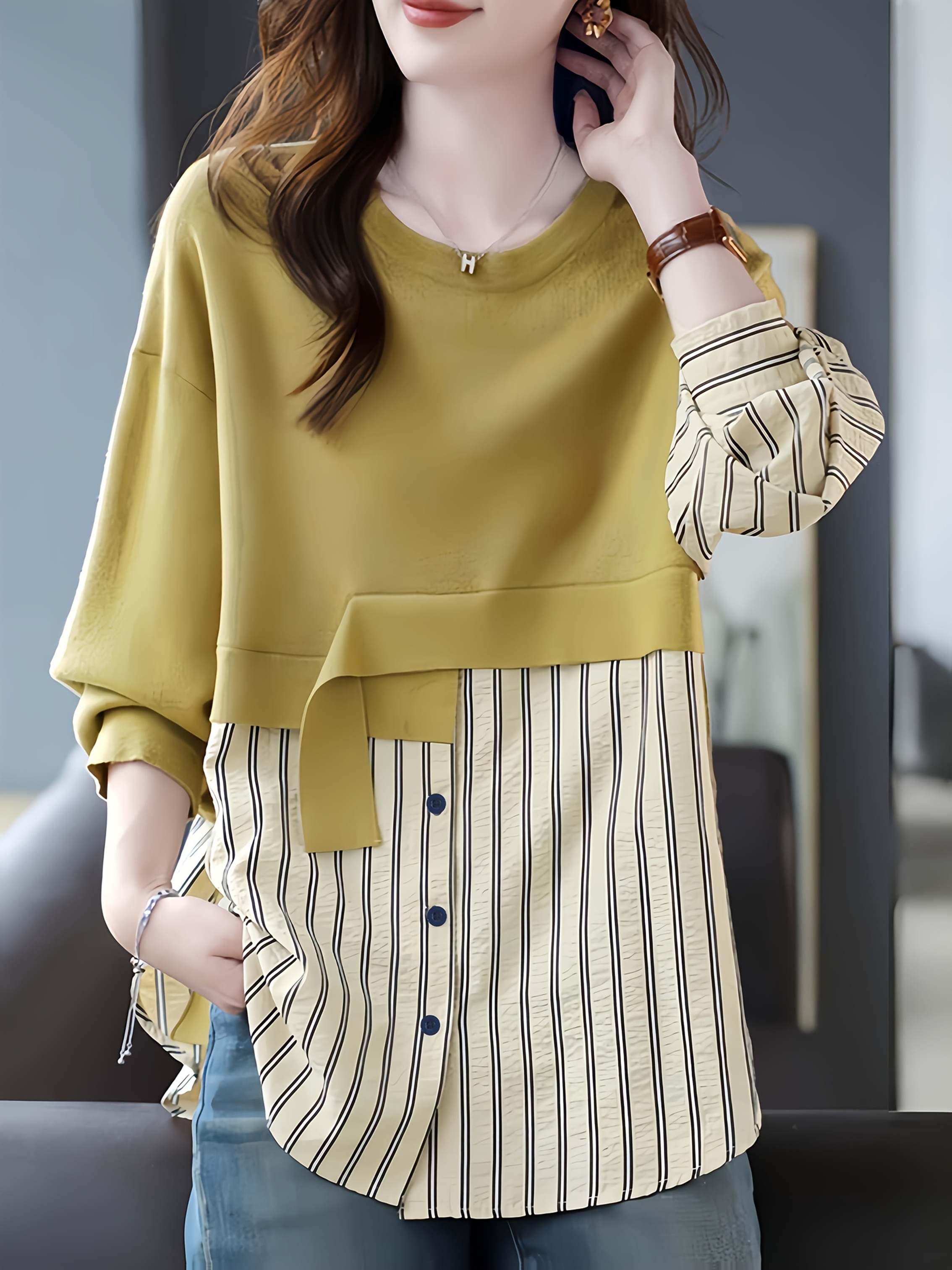 [Plus Size Women's Stylish] Plus Size Women's Stylish Fashionable Round Neck Spliced Striped Shirt Top | Button Up Long Sleeves Evening Tops Blouses High Quality