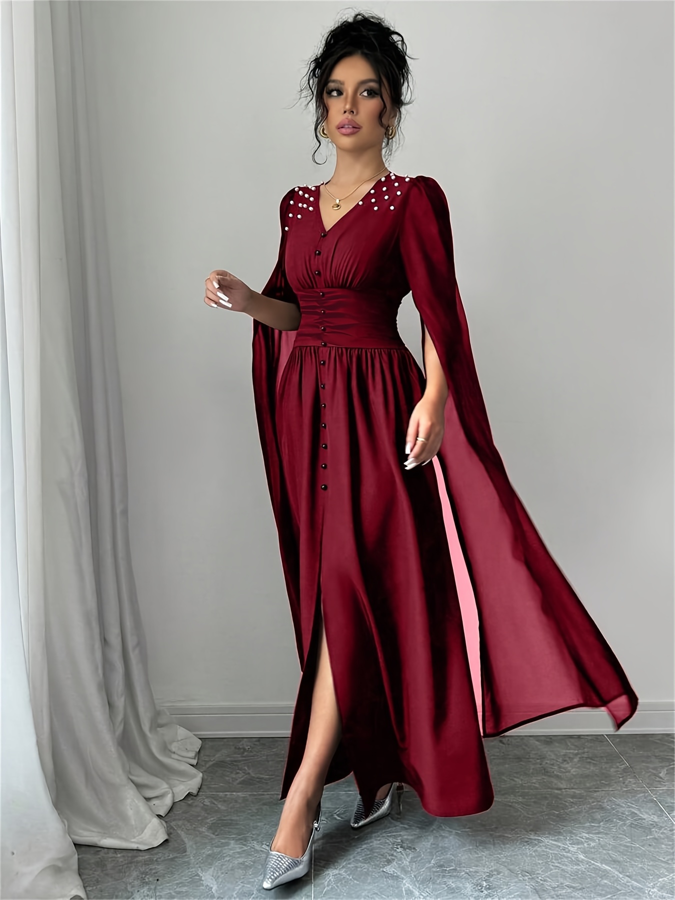 Women'S Elegant V-Neck Maxi Dress with Pearl Accents - Long Formal Party Wedding Guest Dress, Flattering Fit for Summer Events, Formal Events, Parties, Wedding Guest Attire, Vneck Design, Flowy Fabric